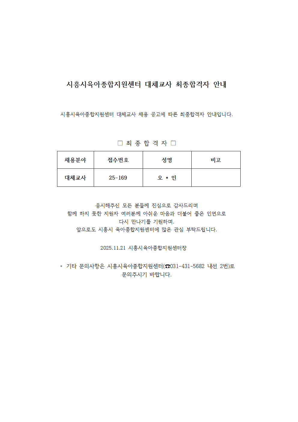 [센터] [공고]시흥시육아종합지원센터 최종합격자 공고(대체교사)
