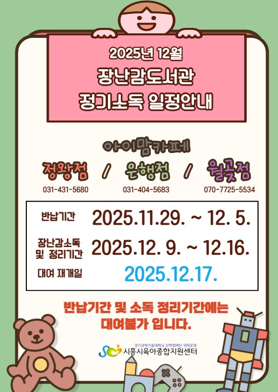 2025년 12월 장난감도서관(정왕점, 은행점, 월곶점) 정기소독 일정안내